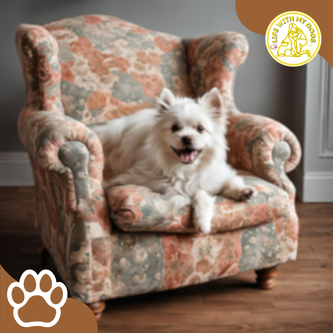 A cozy armchair with a soft, durable cover that is resistant to pet hair and stains. A happy dog lounges comfortably on the chair