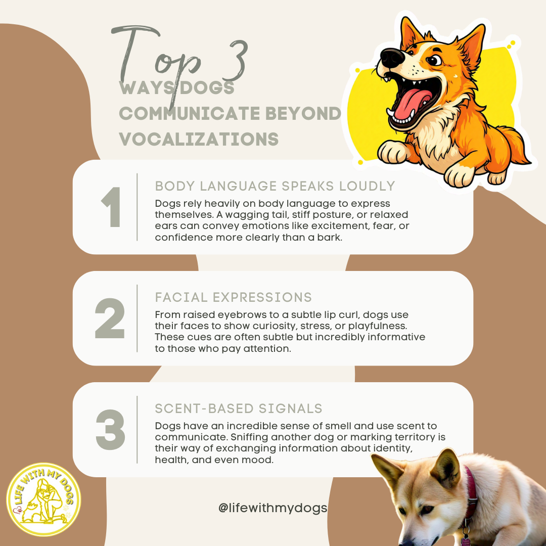 Dogs use body language, sounds, and smells to talk to each other and us.