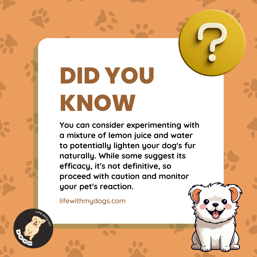 - Lemon Juice: Applying a mixture of lemon juice and water can lighten your dog’s coat. For a natural approach to whitening, try using lemon juice as a mild bleaching agent.